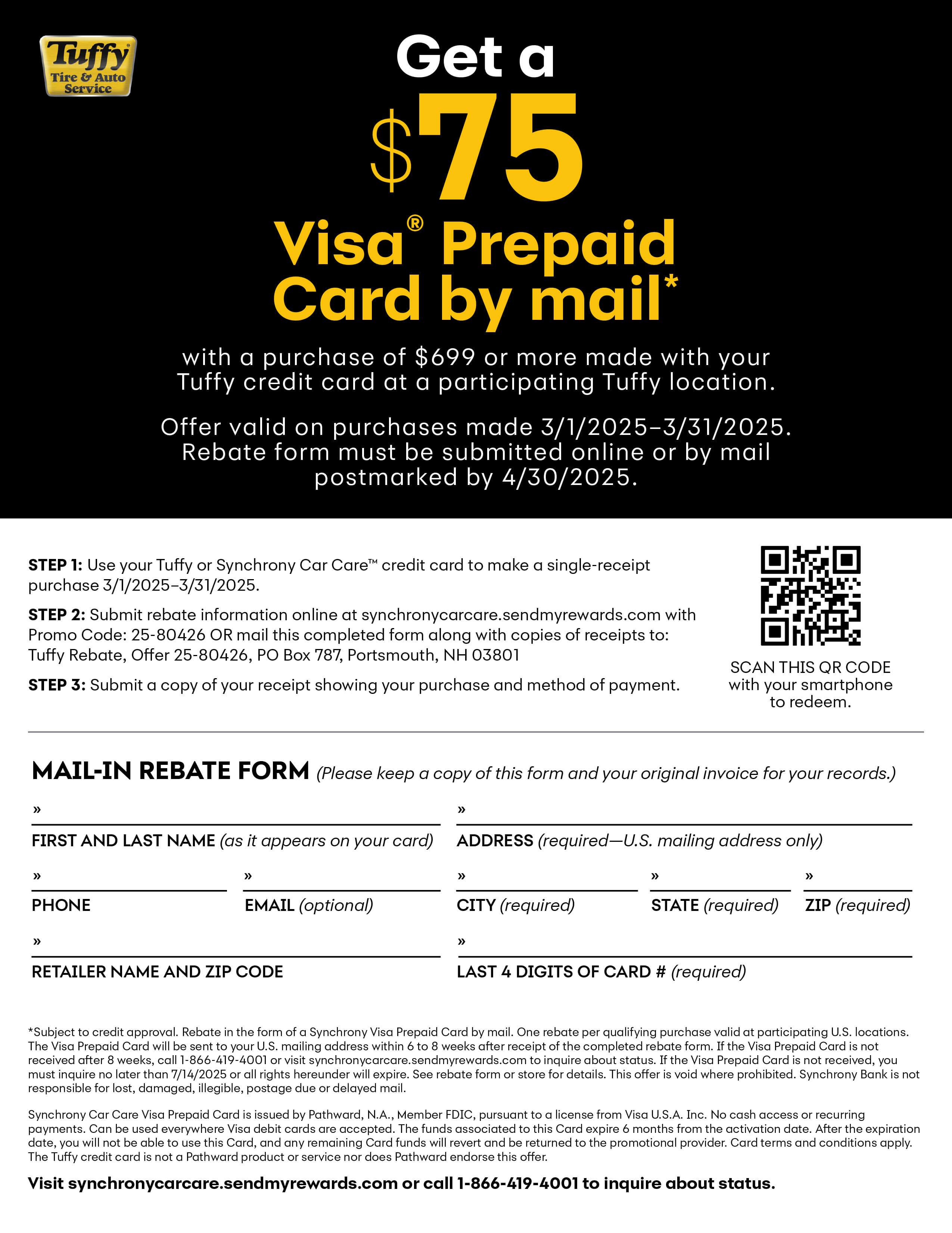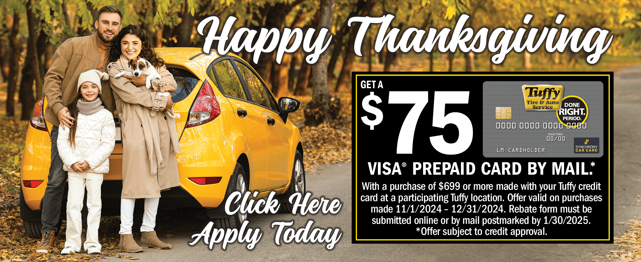6 months special financing on purchases of $199 or more with your Tuffy Credit Card. No annual fee. Convenient monthly payments.